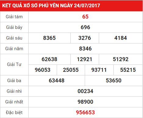 Trên đây là kết quả XSPY thu 2 mới nhất mở thưởng ngày 24-07-2017. Ngoài kết quả xổ số Phú Yên bạn còn có thể xem thêm các kết quả xổ số khác tại website của chúng tôi như: xsvl hom nay, xổ số miền trung, xsmn … Hy vọng rằng với những kết quả xổ số trên website của chúng tôi sẽ là những thống kê giúp các bạn có thể đưa ra được những dự đoán chuẩn xác về kết quả xổ số trong những lần mở thưởng tiếp theo